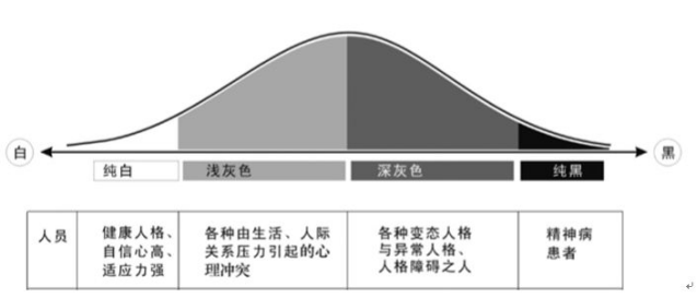 如果将人的心理正常比作白色,心理不正常比作黑色,那么在白色与黑色之间存在着一个巨大的缓冲区域——灰色区域。我们绝大部分人的心理健康状况都处在中间的灰色区域,也就是说绝大部分人都有这样或那样的心理健康问题。