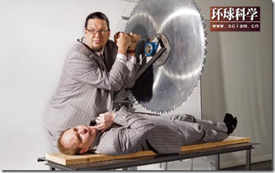 魔术师佩恩和特勒表演的升级版经典魔术“电锯惊魂”,让人产生不可思议的错觉(佩恩操作电锯,特勒扮演那个被“切”为两段的“受害者”)。神经科学家正把一些魔术方法应用到某些类型的实验当中。其中一类实验研究大脑为什么会产生错误的理解,即使这种错误的理解违反了以前所有的现实经验。