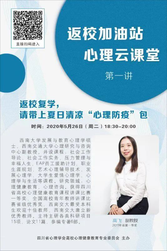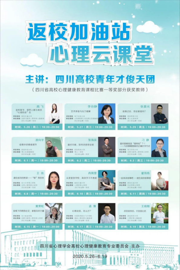 5月中下旬开始,四川省各高校已经陆续复学。为确保同学们复学后能有条不紊地学习和生活,四川省心理学会高校心理健康教育专业委员会组织了四川省各高校的优秀心理教师,从5月26日到6月19日,在网络平台上开展一系列“返校加油站——心理云课堂”直播活动。