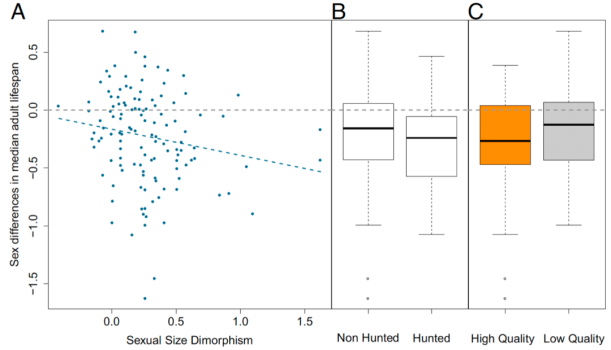 雌性和雄性体型差异,B狩猎,C成人数据中的高质量数据对成年哺乳动物平均寿命的性别差异的影响。