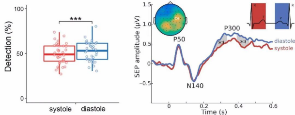 右图:大脑活动中与意识相关的的特定部分(即所谓的P300组成部分)在心脏收缩期被抑制。