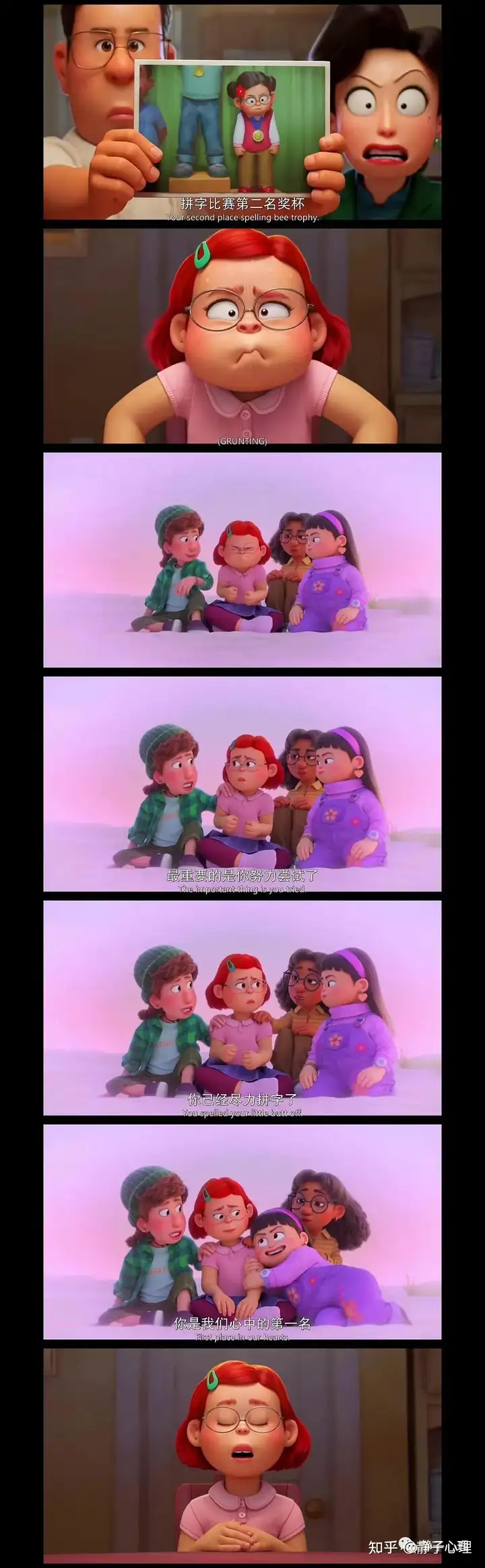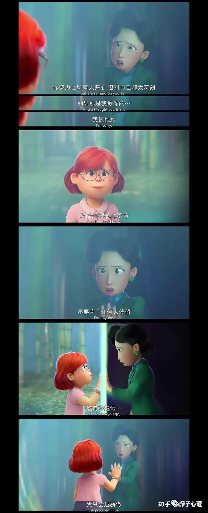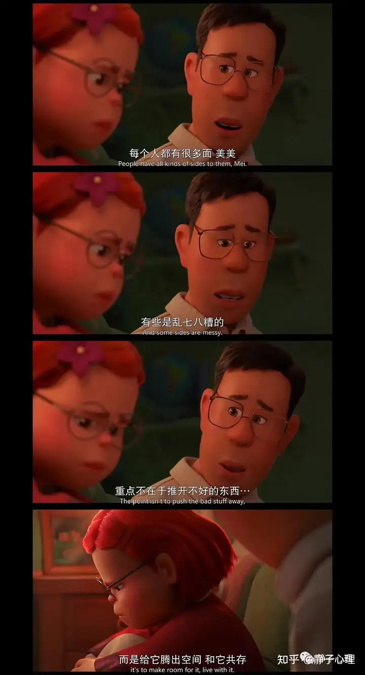 在最后,美美决定不要放走内心的红熊猫,妈妈也决定尊重美美的决定和选择。她对美美说:你努力让所有人开心,但是对自己却太苛刻,如果那是我教你的,我很抱歉……所以不要犹豫不前,不要为任何人停留,你走得越远,我越为你骄傲……