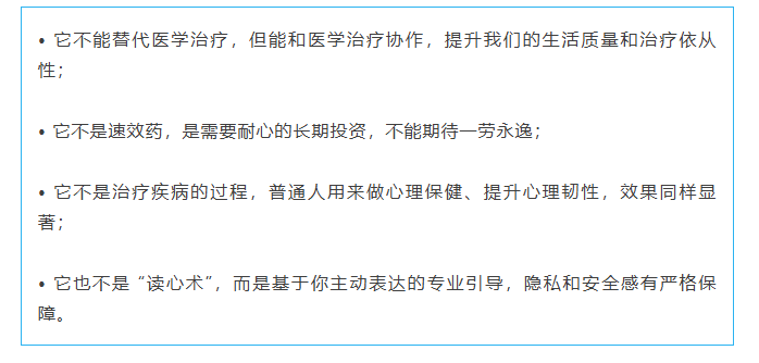 首先要先明确一个概念:心理咨询是专业咨询师运用扎实的心理学理论与一些技术手段,为有心理困扰的人提供安全、保密的谈话空间,协助其探索自我、梳理情绪、改善认知与行为模式,从而自主解决问题、提升心理适应能力的专业服务,它跟医生治病救人还是有本质区别的。心理咨询的核心特点有三个: