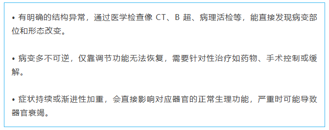器质性疾病是指身体器官或组织发生结构上的实质性损伤、异常增生或形态改变,并因此导致功能异常的疾病类型,关键特征有: